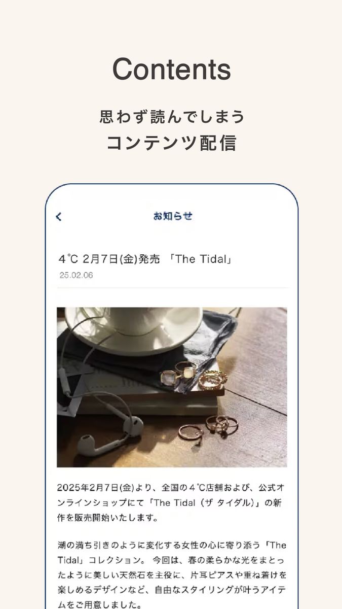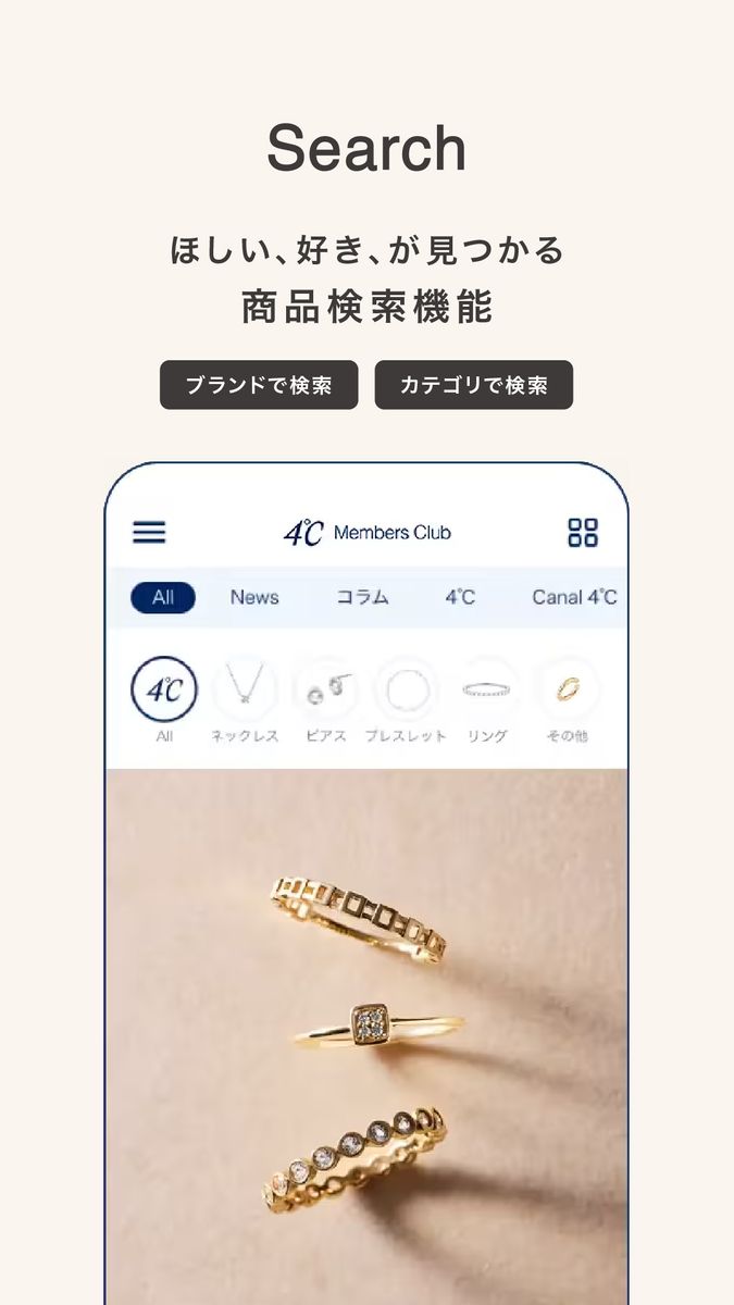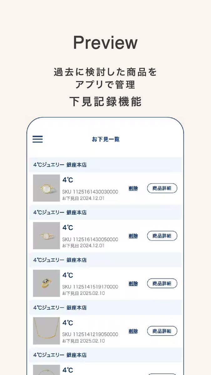 同アプリでは、ユーザーに求められる情報を届けるだけでない。ジュエリーの閲覧記録を保存できる「下見記録機能」も搭載する。リングやブレスレットを選ぶ際、自分に合ったサイズを記録しておくことができる「サイズ管理機能」も備えているという。アプリ内の商品ページからECサイトに遷移できるよう導線も設けられている。