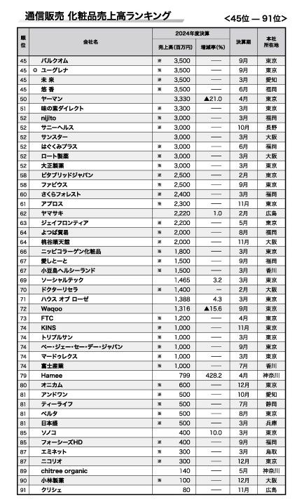 ▽調査対象期間は、2024年4月から2025年3月の間に迎えた決算期の売上高。化粧品通販専業は全社売上高、その他の商品ジャンルを扱う企業は、化粧品部門の売上高を掲載している。