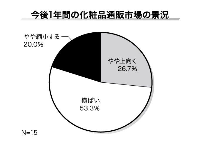 アンケート調査で「今後1年間の化粧品通販市場の景況について」の質問を行ったところ、15社の回答のうち、「横ばい」という回答が約半数(53.3%)を占めた。次いで、「やや上向く」という回答が26.7%、「やや縮小する」が20.0%となった。マーケットの景況感については現状が維持されるという見立てが多かった。