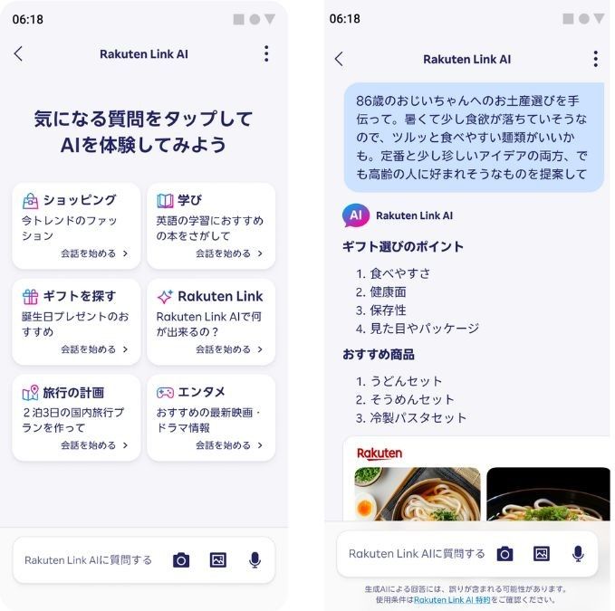 「Rakuten Link」では2024年10月から、チャット形式のAIサービスを提供している。7月30日からは、AIチャットと自動で提案するプロンプトを活用した「楽天エコシステム」内の横断的な検索を可能とした。ユーザーは、テキスト入力、音声テキスト変換、画像検索により問い合わせができ、さらにAIが生成する追加質問に対して複数のプロンプトから回答を選択することで、よりスムーズに求めている情報へアクセスできる。