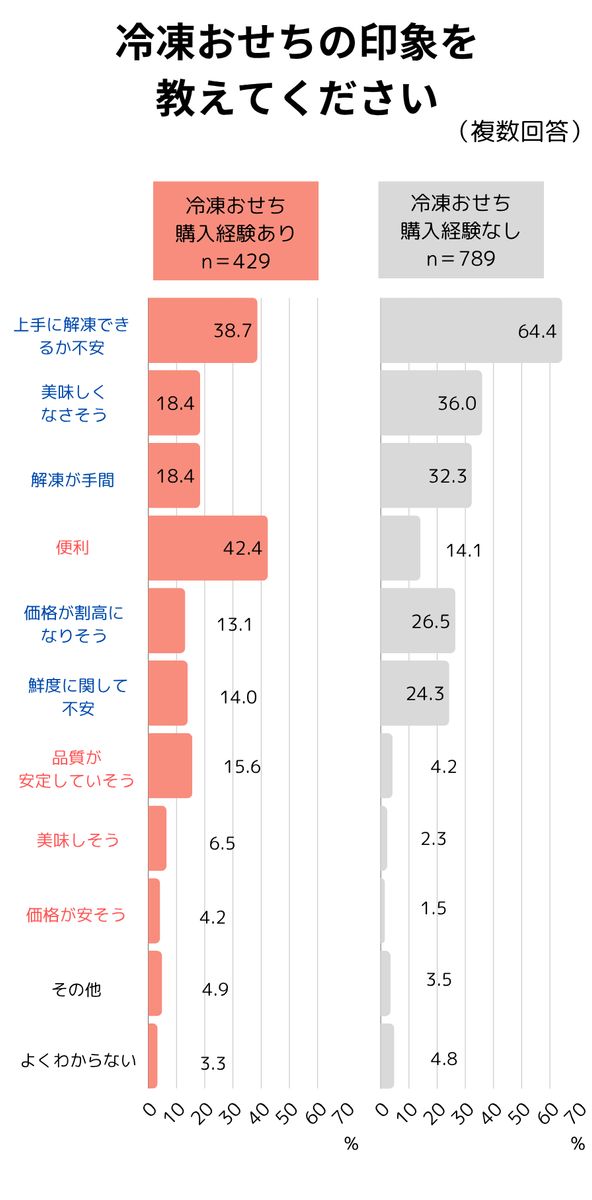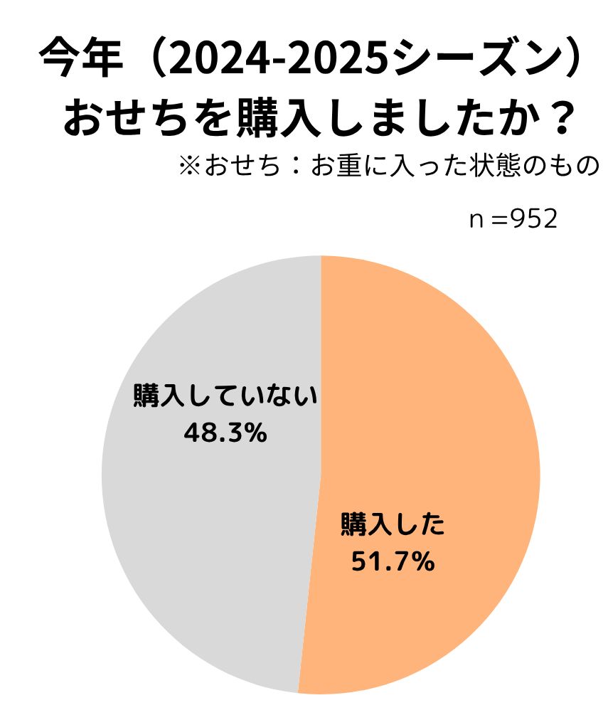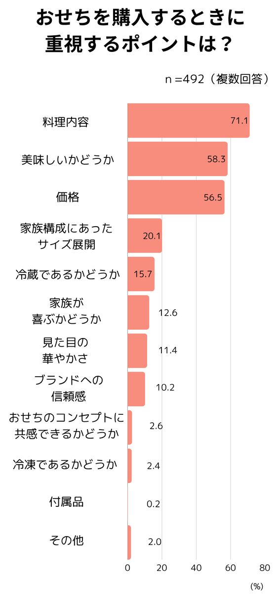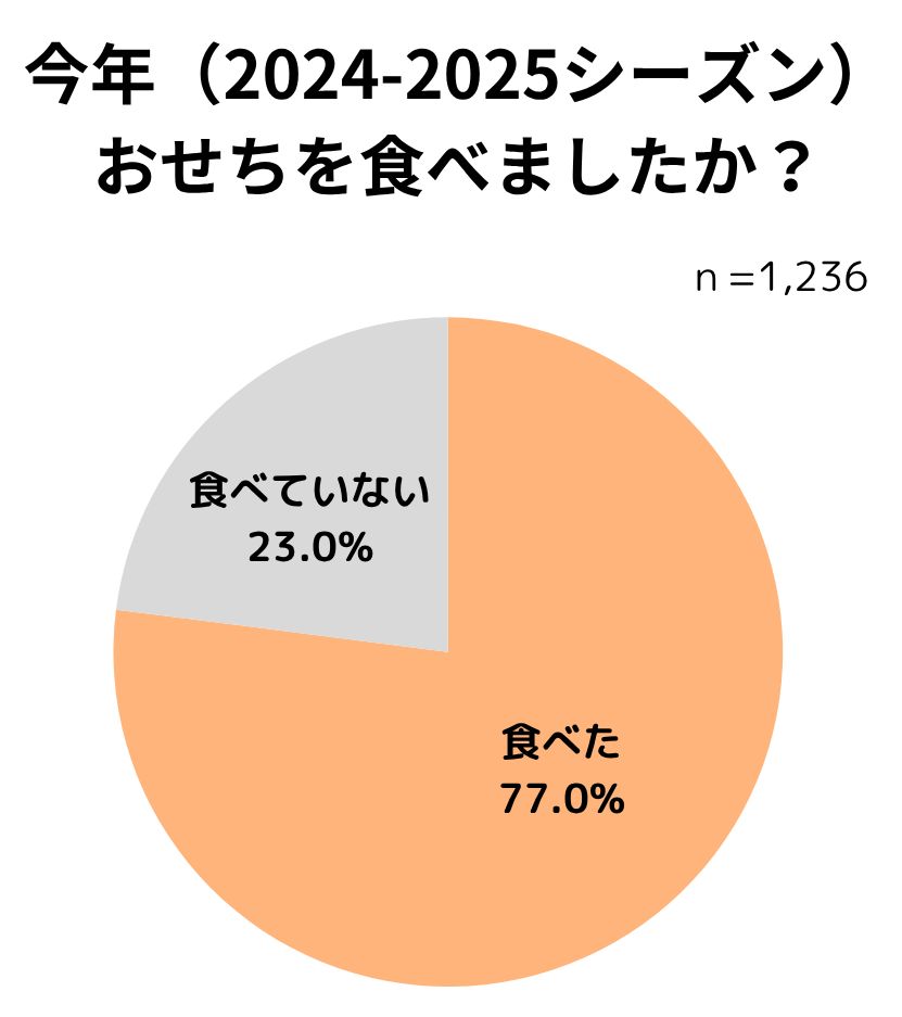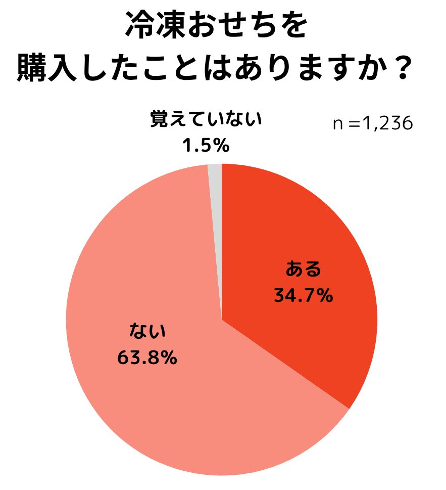 「冷凍おせち」の購入経験者は34.7%で、そのうち76.7%が満足していると回答した。満足の理由として「手軽で便利だった」「美味しかった」が挙げられている。