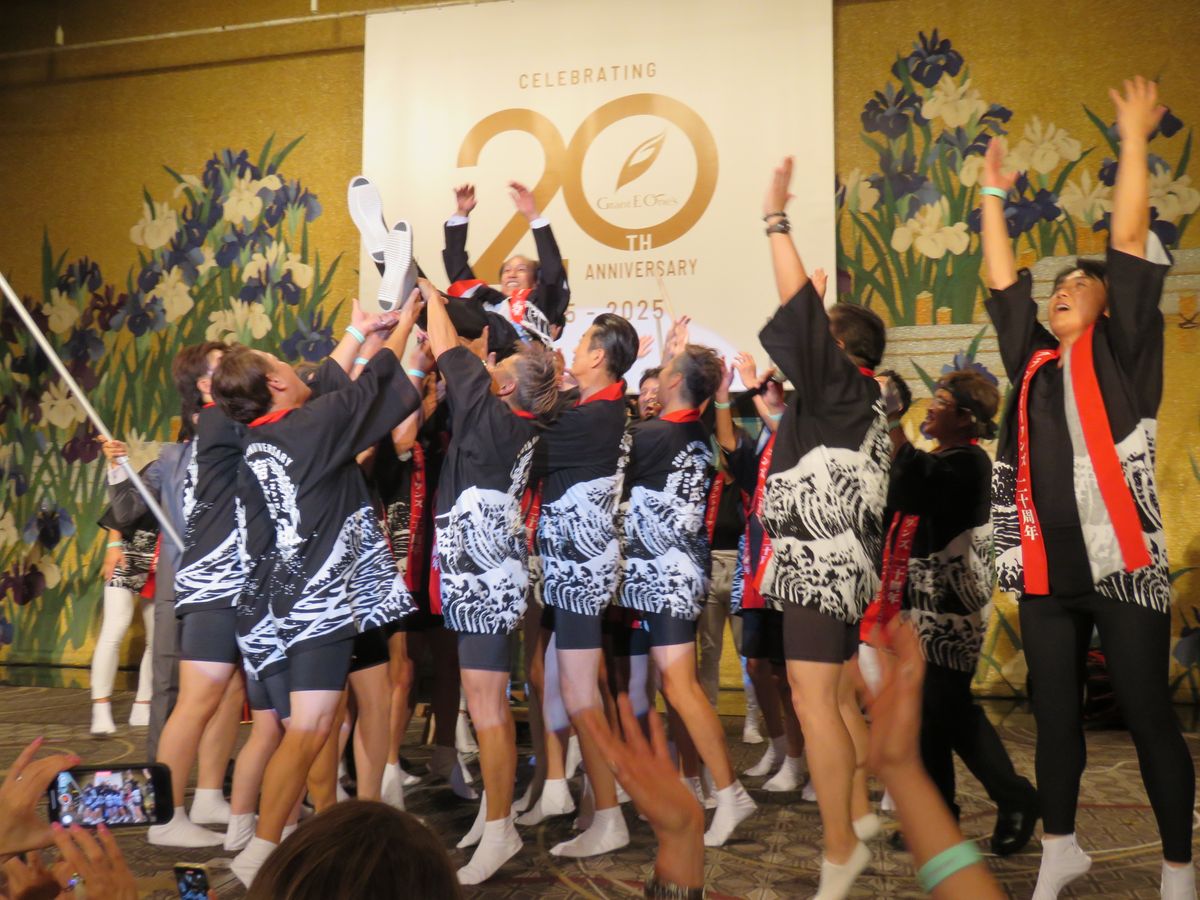式典の後のパーティーでは、会員らがステージ上で、思い思いのパフォーマンスを披露。会員が稲井田社長を胴上げする場面もあった。熱気の中で閉幕を迎えた。