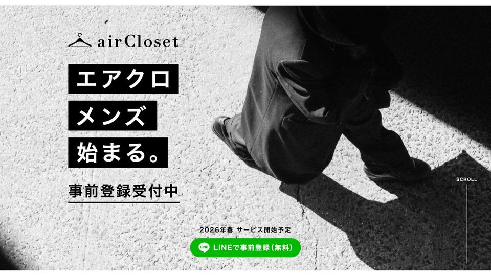 エアークローゼットは9月30日、男性向け月額制ファッションレンタルサービス「airCloset Men’s(エアクロメンズ)」について、ティザーサイト(期待感を高めるサイト)を公開し、事前登録の受け付けを開始した。同サービスは2026年春に開始予定だという。既存のレディース市場向けに加え、メンズ市場にも、事業を拡大させていく狙いがあるという。