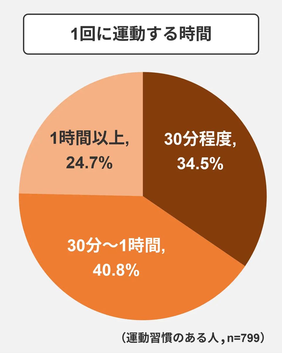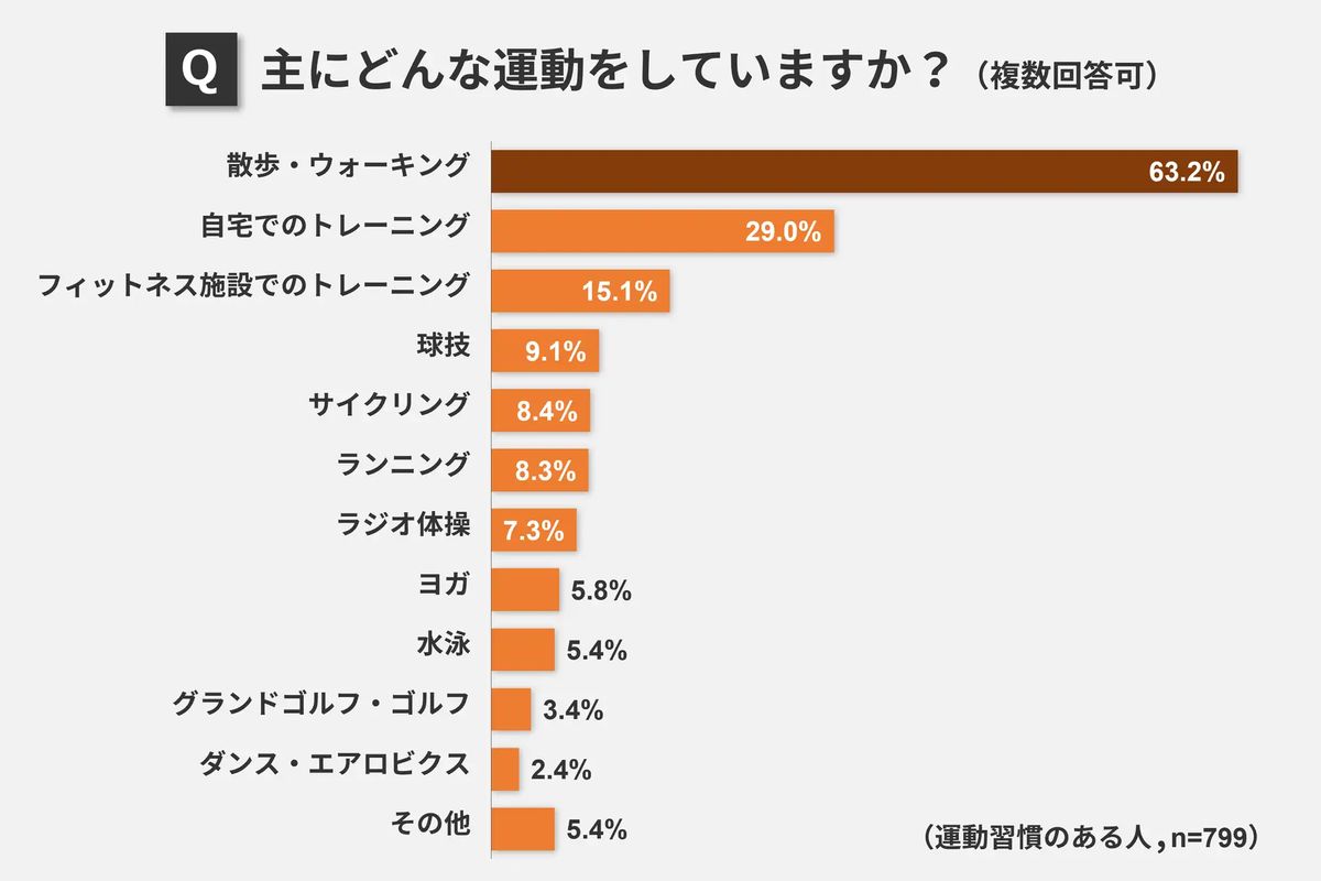 調査によれば、61%の人が普段から運動をしていると回答した。最も人気のある運動は「散歩・ウォーキング」である。運動の目的としては、83.5%が「健康維持」と答えた。運動後のケアとしては「水分を摂る」が最も多かった。