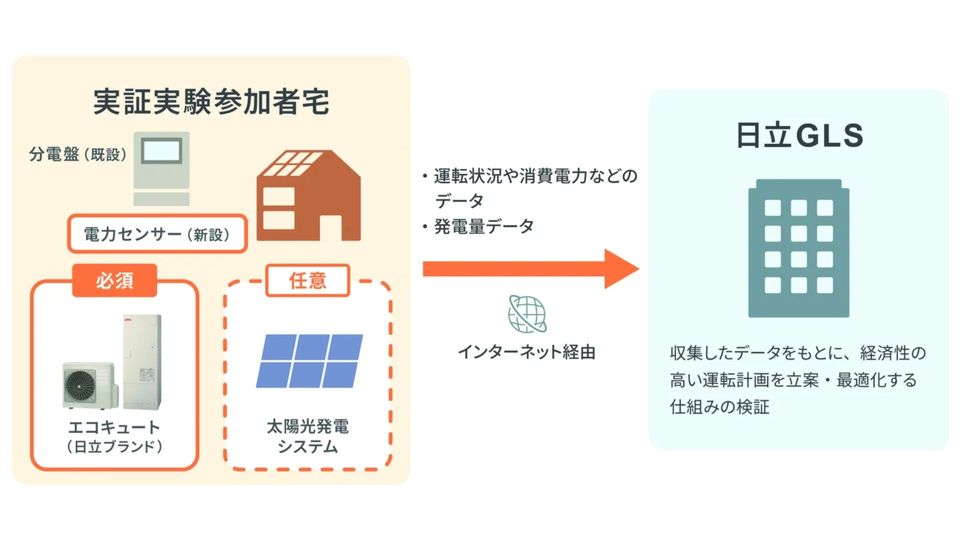 参加者の住宅に設置された日立ブランドのエコキュートなどから運転状況や消費電力などのデータを収集する。稼働状況や消費電力などエネルギー利用に関する知見をもとにAIで分析。運転計画を自動で立案、最適化する仕組みの検証を行う。昼夜の分割運転による経済性のシミュレーションや、太陽光発電による自家消費の経済的メリットの評価も実施する。