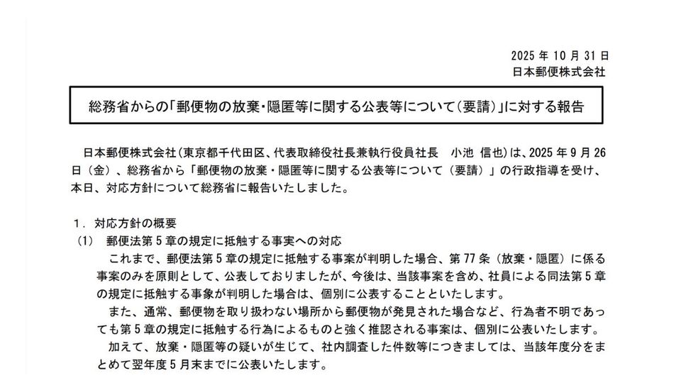 日本郵便は10月31日、局員が郵便物を放棄・隠匿した場合だけ公表する運用を改め、郵便物が紛失したり、差出人への返還が困難になったりした場合でも違法性を問わずに個別に公表していくと発表した。郵便法が適用外のゆうメールやタウンプラスについても公表を行っていく。