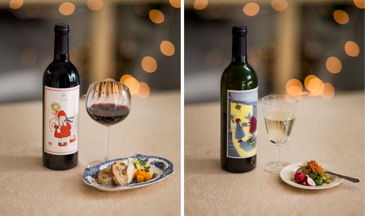 ▲f winery Xmasラベル 128カベルネ・ソーヴィニヨン〈赤〉 /127マスカット・ゴルド・ブランコ〈白〉