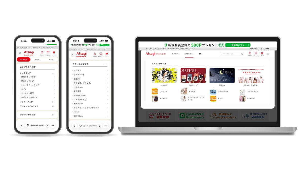 「アツギオンラインショップ」のリニューアルにおいては、(1)検索性の向上(2)直感的な操作性(3)決済方法拡大─を実施した。各商品の詳細ページでは、カラーやサイズのバリエーションと在庫状況を画像付きの一覧で表示することで、商品の比較検討がしやすくなったという。