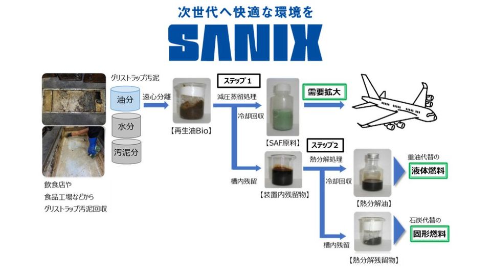サニックスグループが既製品として取り組んでいる「再生油Bio」から良質な油を分離、精製して持続可能な航空燃料(SAF)の原料を生産している。