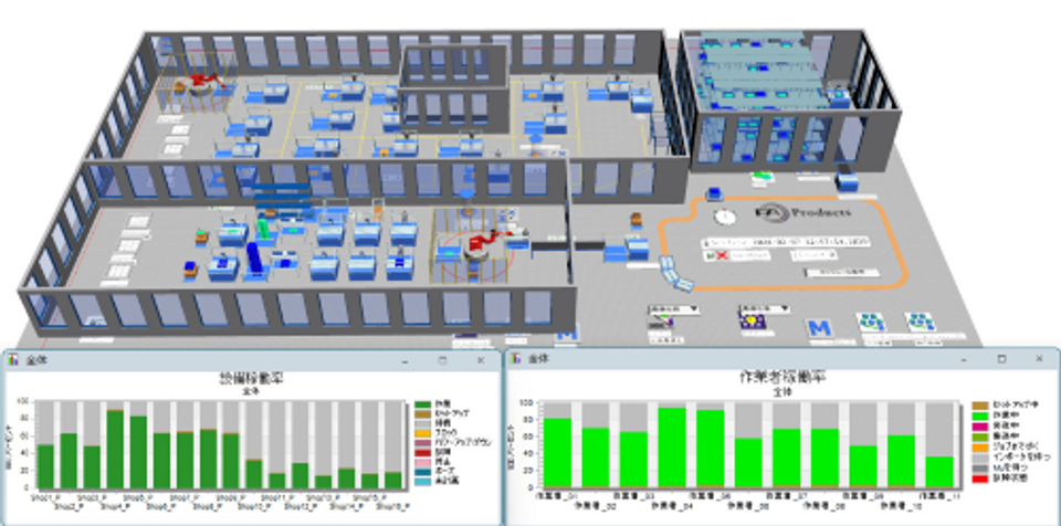 シーメンスの3Dシミュレータ「Plant Simulation」を活用し、倉庫内作業を仮想空間上で再現し、定量データに基づく分析と自動化の提案を行う。倉庫内全体の作業者とマテハンの動きを再現し、可視化する。