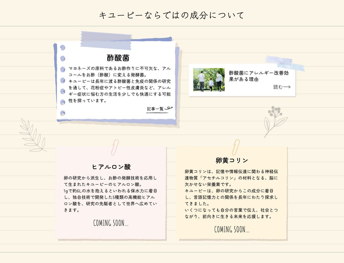 「キユーピーウエルネスノート」は、酢酸菌、ヒアルロン酸、卵黄コリンといった成分の魅力を深掘りし、正しい知識をわかりやすく伝えることを目指している。これらの成分は、健康や美容に効果が期待できるとされている。