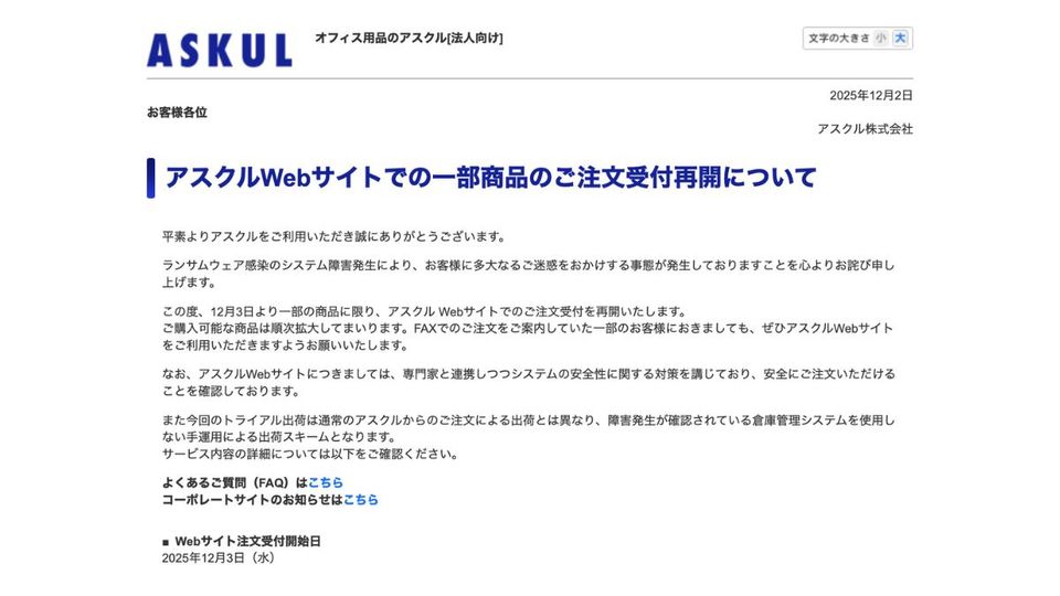 アスクルは12月3日、法人向け通販サービス「ASKUL」において、ウェブサイトにおける一部商品の注文受け付けを再開した。10月19日にランサムウェア感染によるシステム障害が発覚し、通販サービスを休止していた。これまでFAX注文や一部サービスでのウェブ注文を再開していたが、今回、「ASKUL」のメインサイトでの注文受け付けを再開する。今後、順次、対応商品を拡大していくという。