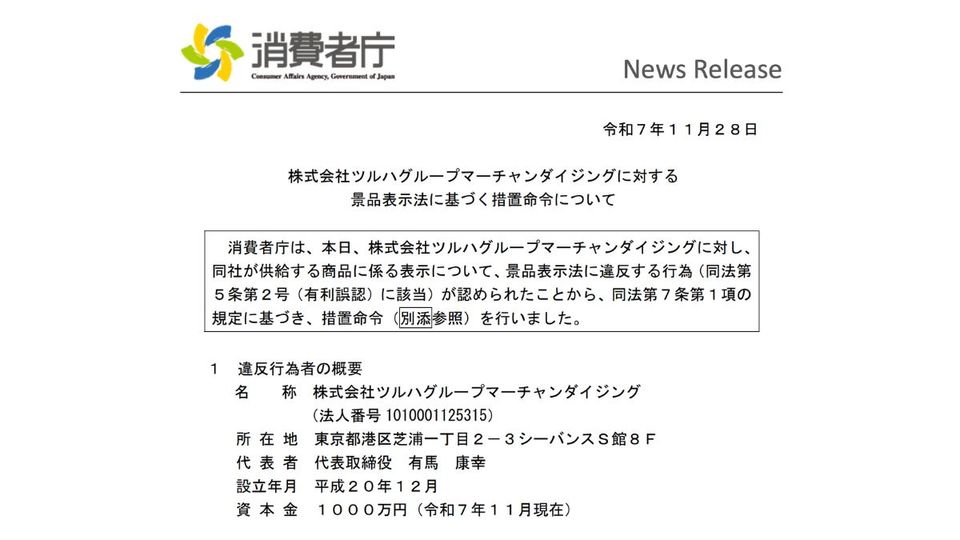 消費者庁は11月28日、ツルハグループマーチャンダイジング(本社東京都)に対し、同社が供給する商品に係る表示について、景品表示法に違反する行為として有利誤認が認められたことから、措置命令を行った。自社ECサイト「ツルハグループe-shop本店」の二重価格表示が対象となった。