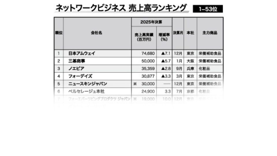 本紙調査をもとに集計したネットワークビジネス(NB)主宰企業108社の合計売上高は5458億1300万円だった。前年と比較可能な37社の売上高から算出した実質成長率は1.9%のマイナス成長となった。業界首位は日本アムウェイが堅持。上位では、6位のベルセレージュ本社が3.3%増、7位のフォーエバーリビングプロダクツジャパンが10%増、10位のナチュラリープラスが2%増だった。年商100億円を超える大手企業で増収だったのはこの3社のみだった。