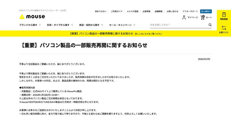 同社は2025年12月23日に、「mouse(マウス)」「NEXTGEAR(ネクストギア)」「G TUNE(ジーチューン)」「DAIV(ダイブ)」製品の販売を一時停止。26日からは「MousePro」製品を一時販売停止としていた。