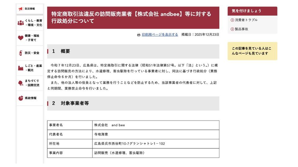 広島県は2025年12月23日、訪問販売の方法により水道修理や害虫駆除の役務提供を行っていたand bee(アンドビー、本社広島県、寺地海意代表)に対し、特定商取引法に基づき、6カ月間の業務停止命令を行った。同社の寺地代表に対しても、同期間の業務禁止を命じた。低額な広告表示で集客しながら、現場では消費者の無知につけ込み高額な契約を締結させていたという。