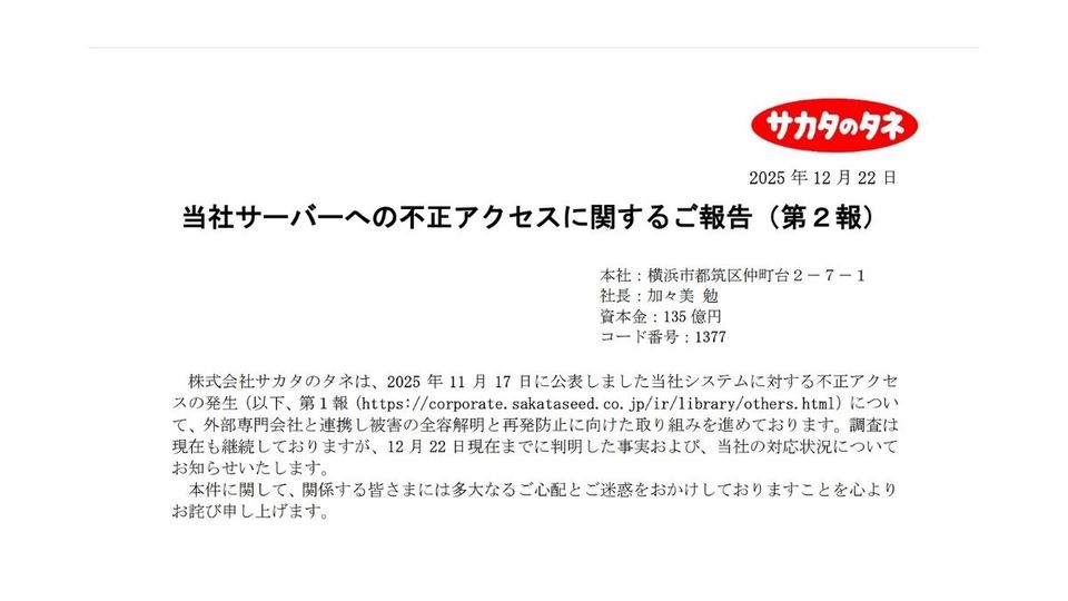 サカタのタネ、不正アクセスの被害発表