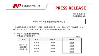 日本郵便、ゆうメール運賃を値上げ 11月から最大20円