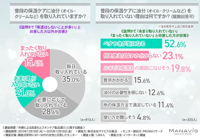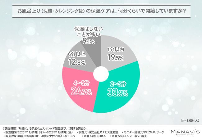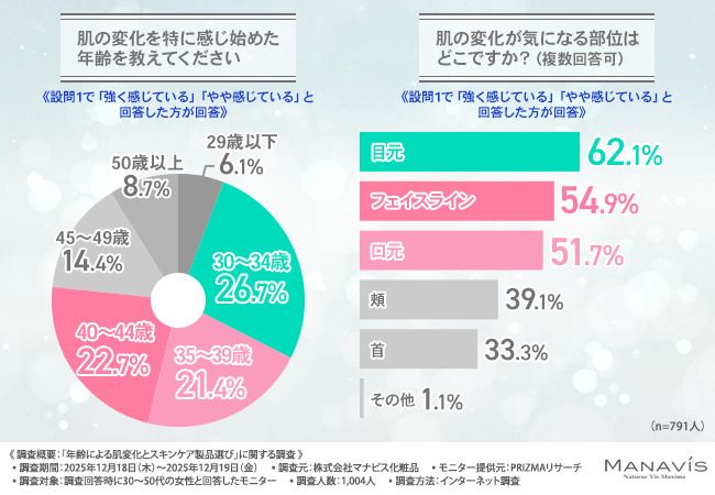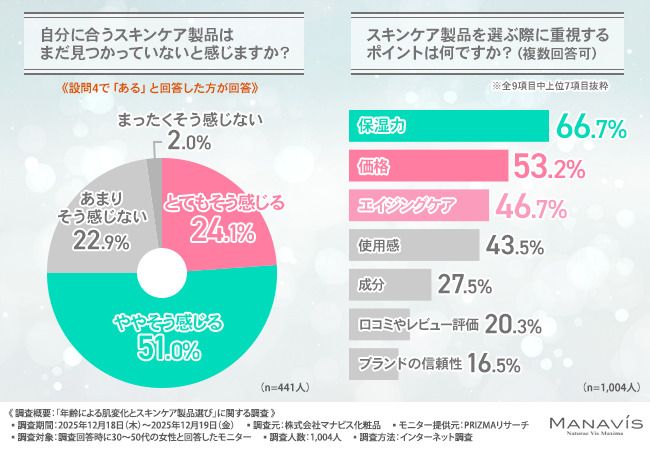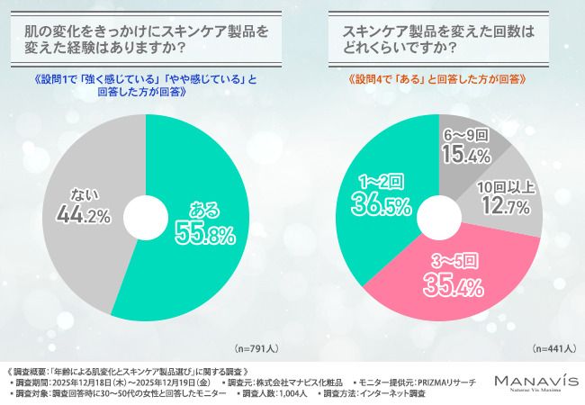 マナビス化粧品は、30〜50代の女性を対象に「年齢による肌変化とスキンケア製品選び」に関する調査を実施した。調査は2025年12月18日から19日にかけて行われ、1,004人が参加した。
