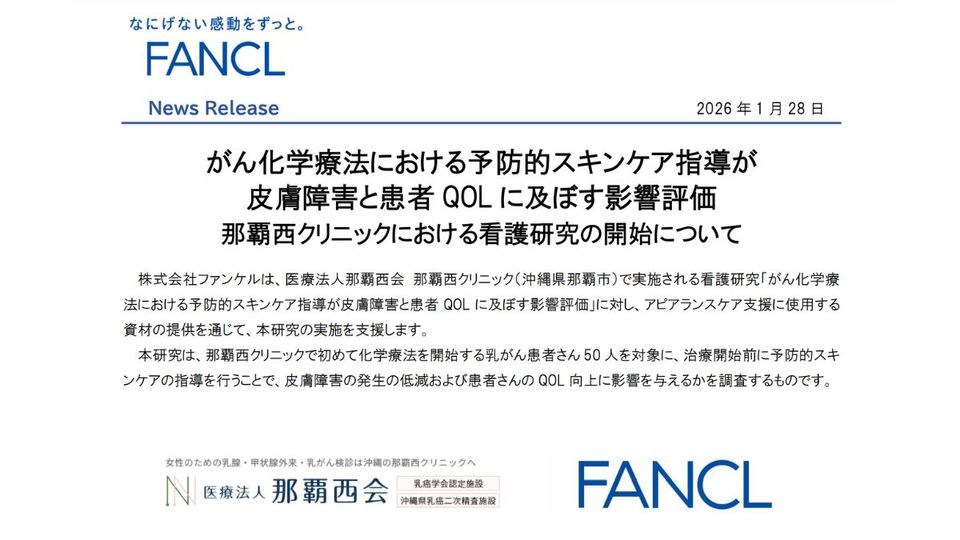 ファンケル(本社神奈川県、三橋英記社長執行役員)はこのほど、医療法人那覇西会 那覇西クリニック(所在地沖縄県)が実施する看護研究「がん化学療法における予防的スキンケア指導が皮膚障害と患者QOLに及ぼす影響評価」に対し、アピアランスケア支援に使用する資材の提供支援を行うと発表した。