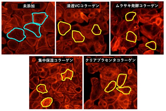 研究では、ヒト表皮角化細胞(NHEK)に対して4種の独自コラーゲンを単独添加し、収縮力を促進する効果を確認した。さらに、NHEKの細胞骨格自体を収縮させる効果も確認された。この結果、4種の独自コラーゲンによりNHEKが収縮し、毛穴周辺の表皮構造が整うことで、毛穴の目立ちが改善される可能性が示された。
