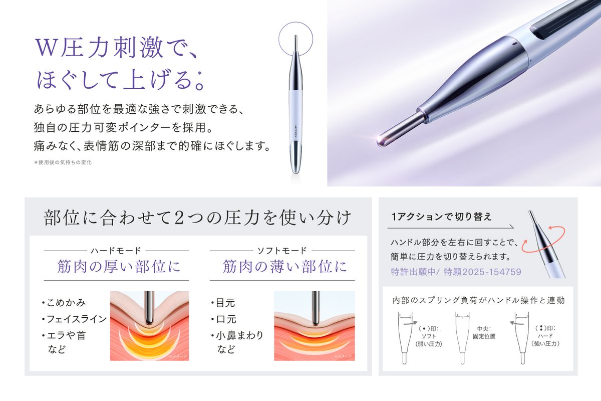 「SHAPE POINTER」は、フェイスラインを整える「シェイプポイントヘッド」と、美肌へ導く「マイクロカレントヘッド」を1本に搭載している。「シェイプポイントヘッド」は、ペン先を回すだけで圧力を2段階に切り替え可能。使用部位に合わせた最適な圧力でアプローチできるという。痛みを感じることなく、深部までしっかりと無理なく刺激を与えることが可能だとしている。