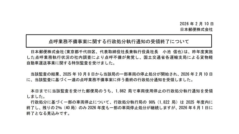 2025年10月から点呼業務不備に伴う一部車両の停止処分を受けている日本郵便は2月10日、国土交通省の最終の行政処分通知を受領したと発表した。