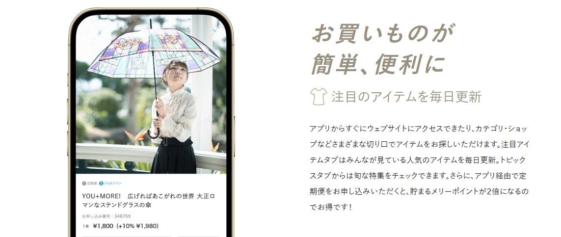 また、アプリから「定期便」を申し込むと「フェリシモメリー」が2倍貯まる特典や、アプリ限定セール「幻市」の開催など、特別な体験を提供している。貯まったポイントは新作プレゼントや豪華プレゼントが当たる「夢くじ」に利用でき、社会貢献活動への寄付も可能である。