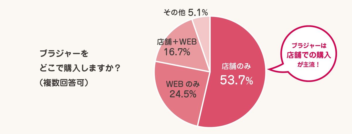 ▲「1位:店舗のみ(53.7%)」「2位:WEBのみ(24.5%)」「3位:店舗+WEB(16.7%)」という順位に。適切なサイズやフィット感を重視するブラジャーは、店舗での購入が主流となっている