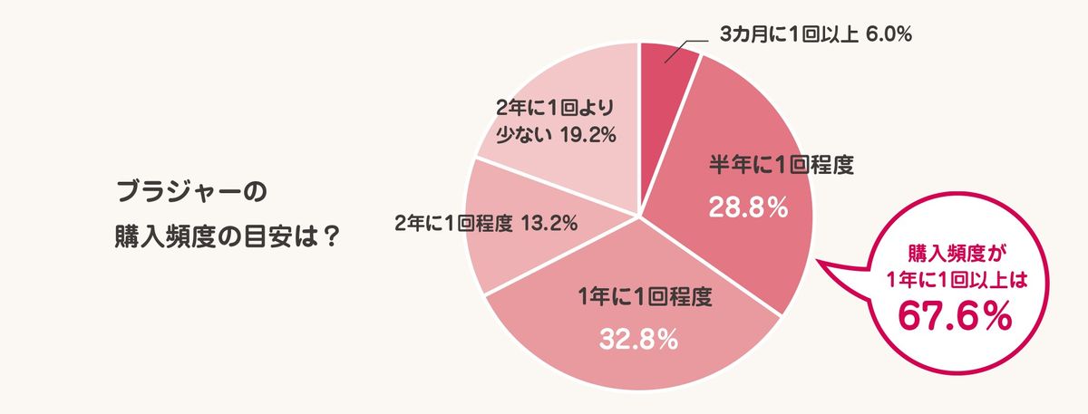 ▲、「3か月に一回以上(6.0%)」「半年に1回程度(28.8%)」「1年に1回程度(32.8%)」と、1年に1回以上ブラジャーを購入している人は全体で67.6%