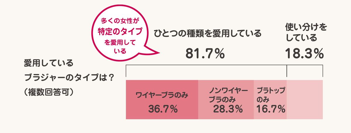 ▲「ワイヤーブラのみ」を愛用している人が最も多く、次いで「ノンワイヤーブラのみ」。81.7%が「特定のタイプのみ」を愛用している傾向が判明