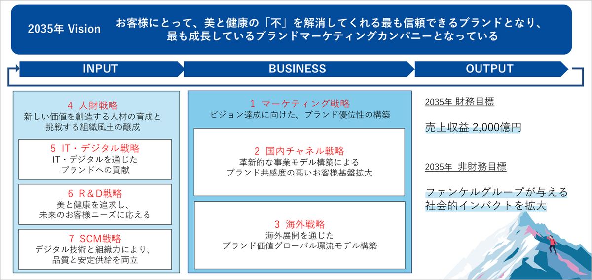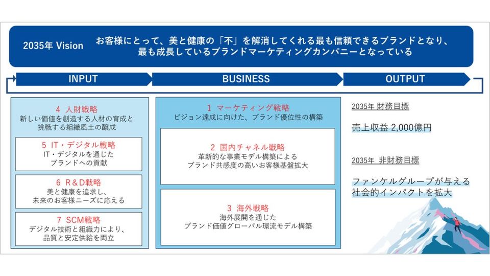 同社は「2035年に目指す姿(Vision)」として、「お客様にとって、美と健康の『不』を解消してくれる最も信頼できるブランドとなり、最も成長しているブランドマーケティングカンパニーとなっている」を掲げた。