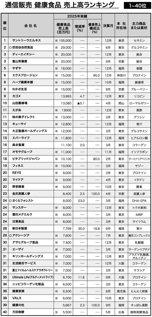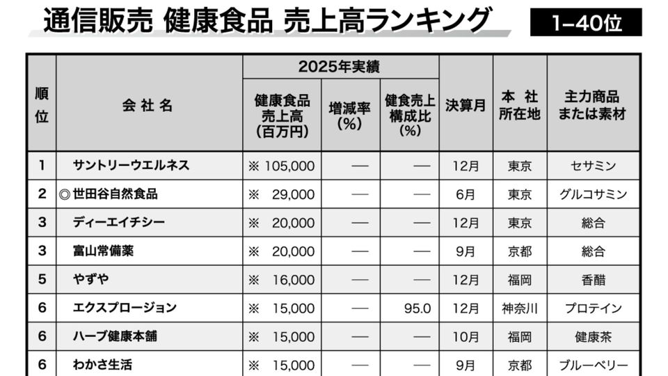 ▽調査対象は、2025年1~12月の間に迎えた決算期の売上高実績。健康食品だけを取り扱う専業企業は全社売上高を、他の商品ジャンルも取り扱う兼業企業は健康食品部門の売上高を掲載した。一部の兼業企業は健康食品以外の商材の売上高を含む場合もある。