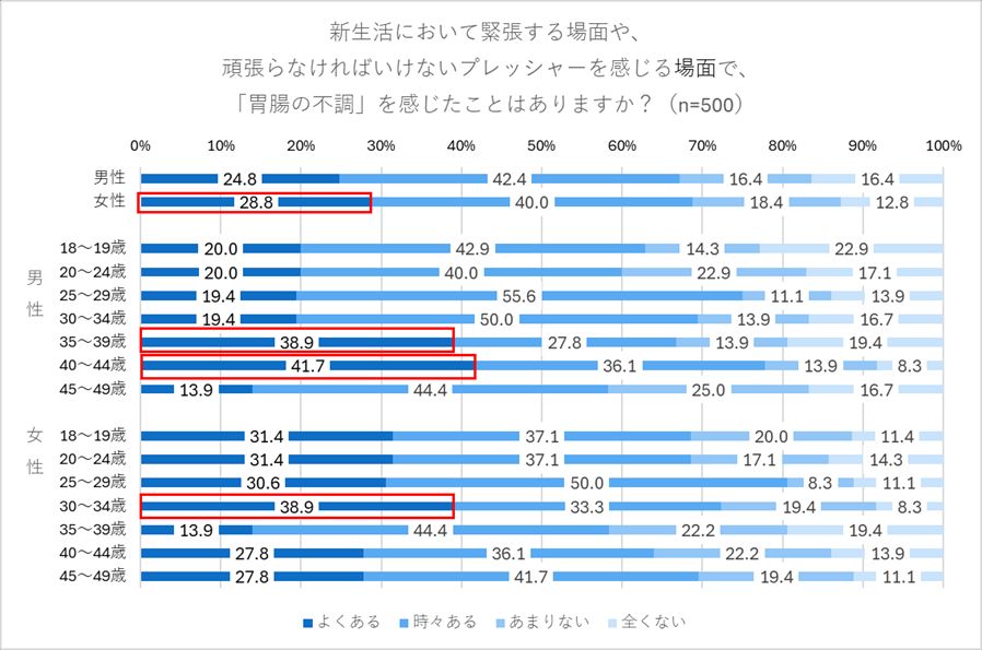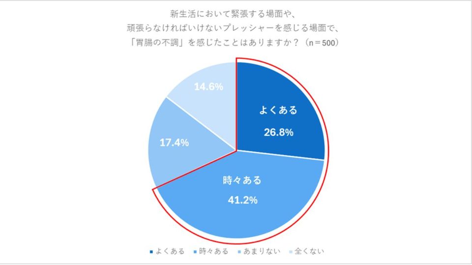調査は3月、新生活を控えた10~40代の男女500人を対象に実施された。精神的な緊張やプレッシャーによる胃腸の不調について、「よくある」「時々ある」と回答した人は計68.0%に達した。