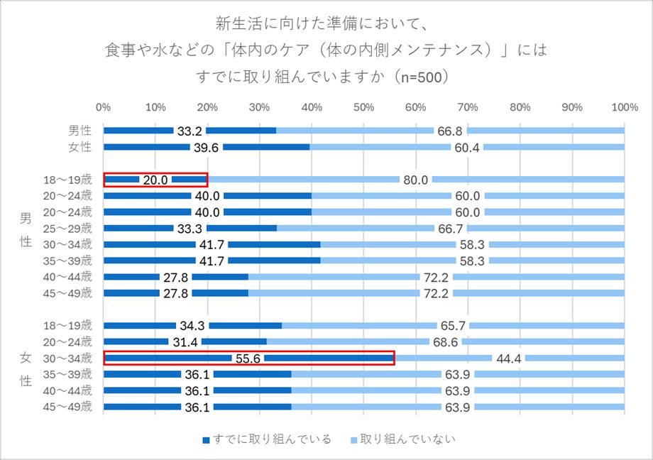 ▲重要性は理解しつつも、実際に「体内のケア」を実践できている人は約4割