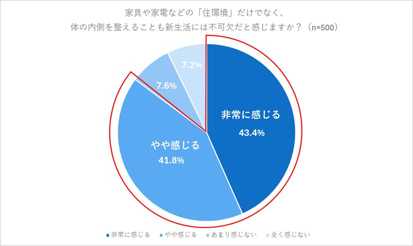 日本トリムでは、こうした背景から、健康管理への意識は高まっていると分析している。身体のパフォーマンス維持にケアが重要だと答えた人は9割を超え、さらに85.2%が、「家具や家電などの『住環境』だけでなく、体の内側を整えることも新生活には不可欠であると感じる」と回答した。