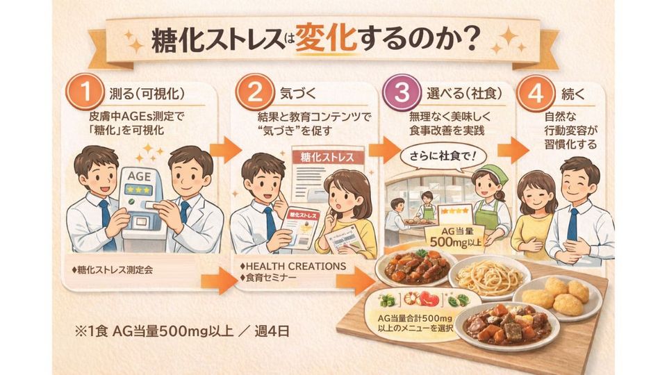 主な結果として、糖化ストレス指標(SAF)が低下し、特に女性および40歳以上で変化が顕著だったとされている。生活習慣を大きく変えずに低下が見られたことから、「社食」という日常インフラを活用することで、従業員の健康意識向上と実際の指標の変化の両立が可能であることが示されたという。