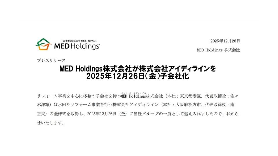 メッドホールディングス、大阪のリフォーム会社を子会社化 「クジラのマークの水道屋さん」を