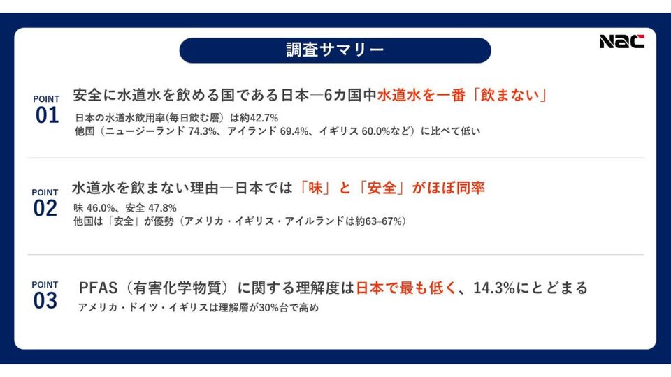 ナック、日本が水道水の飲用率が最も低い 世界各国の水道水意識調査結果発表