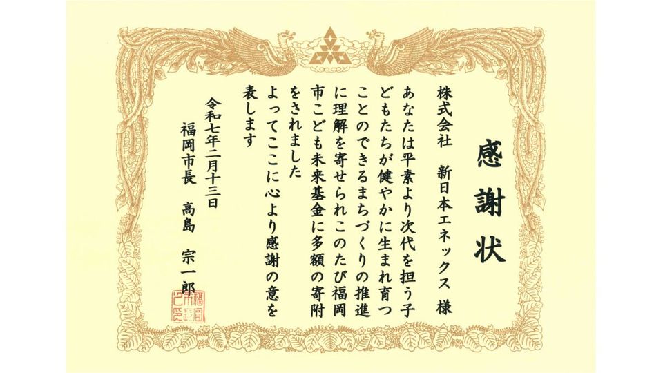 新日本エネックス、福岡市長から感謝状